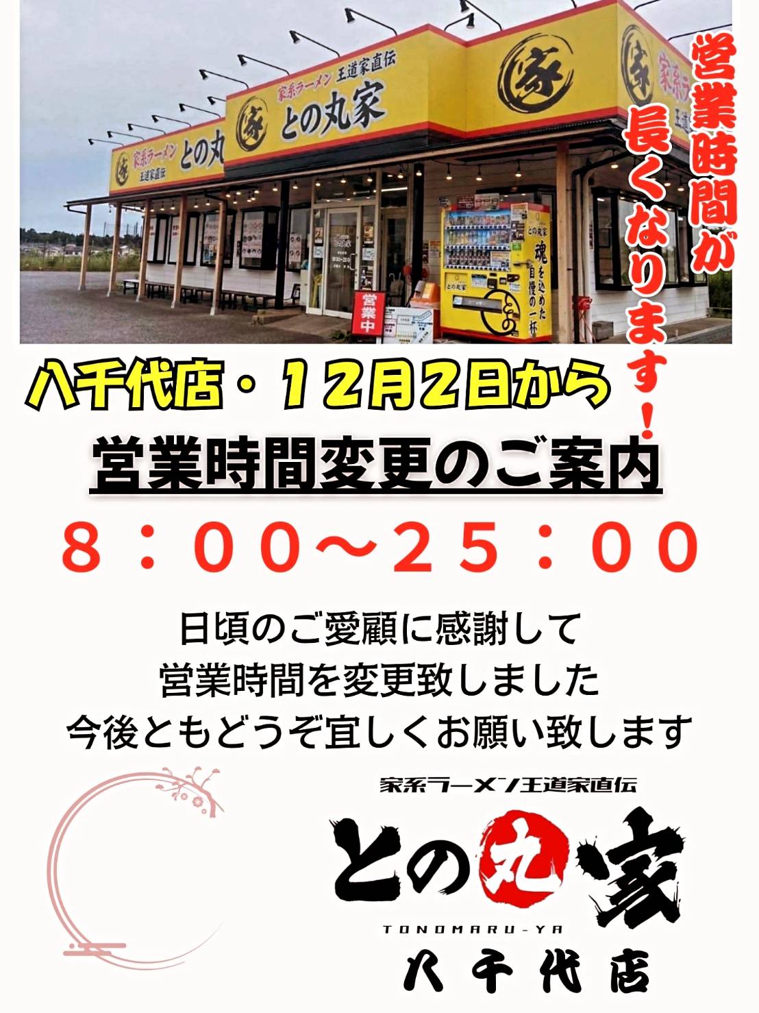 2025年12月2日の営業より、との丸家八千代店の営業時間が1時間延びます。