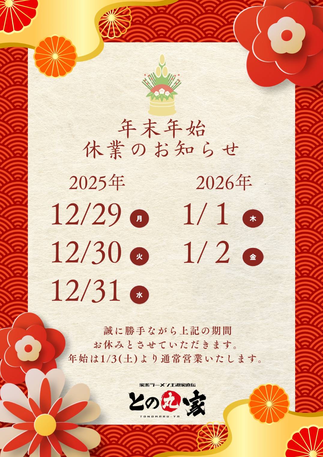 家系ラーメン王道家直伝との丸家グループ全店舗のお休みが以下になります。