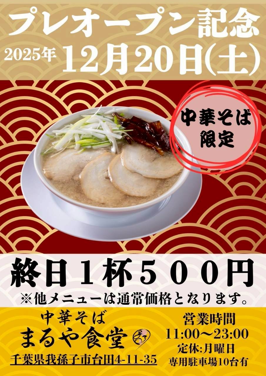 まるや食堂プレオープン特典!! Posted on 2025年12月19日2025年12月19日 by tonomaru 12月20日プレオープンの特典として終日、中華そば(並)500円でご提供させていただきます。※他メニューは通常価格でのご提供とさせていただきますのでご了承くださいませ。